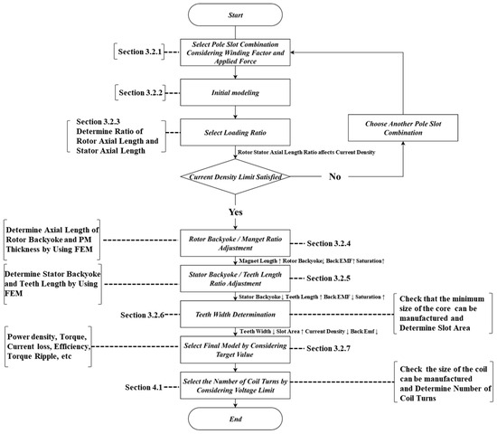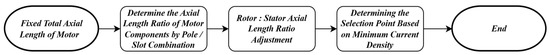 圖 7. 通過按比例改變轉子和定子背軛相對于永磁體厚度的大小,同時保持總軸向長度不變,來調整電磁負載,即負載比。隨著永磁體厚度的變化,可用于繞線的槽面積也隨之變化;因此,該過程可以看作是固定轉子軸向長度與定子軸向長度的比值。目標負載比的確定方法如下:首先,考慮到制造工藝,將最小永磁體厚度作為參考值。基于此,按比例計算定子和轉子背軛的大小,并確定氣隙。在有限的軸向長度范圍內,重新分配定子和轉子的軸向長度。對于每個重新分配的負載比,假設繞制一個與槽面積相同大小的繞組,繞制一匝。經過分析,從空載反電動勢中得出達到目標輸出所需的電流。將該電流除以槽面積即可得到電流密度,并選擇對應于最低電流密度的負載比。選擇最小電流密度點的原因在于,它代表了產生相同輸出所需的最小電流,這表明負載比在該點分布最為合理。通過這種方法,在保持總軸向長度不變的情況下,利用幾何比例分割法確定了滿足目標性能且電流密度最小的負載比。圖 8顯示了用于選擇與最小電流密度對應的轉子-定子軸向長度比的負載比確定流程圖。
