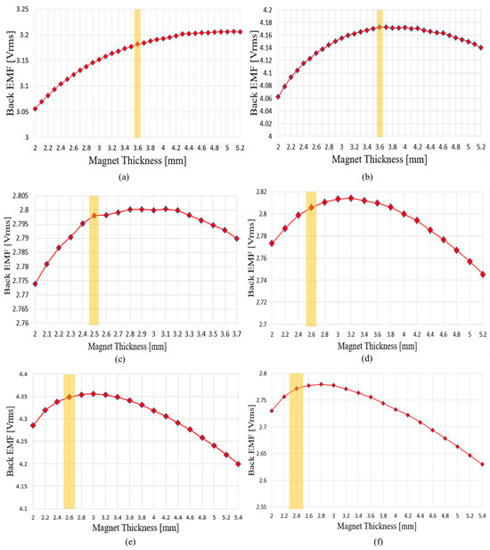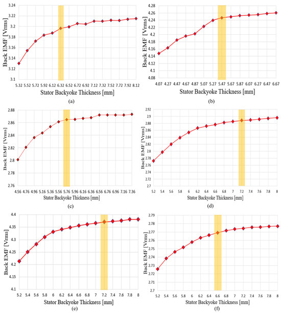圖 17. 3.2.5. 齒長和定子背軛厚度比的調整 圖 18顯示了空載相反電動勢 (BEMF) 的變化以及根據定子背軛厚度和齒長調整后選定的點。本節調整了定子齒長與定子背軛厚度的比值。隨著定子背軛厚度的增加,磁通路徑得到保證,從而導致通過有限元分析得到的空載相反電動勢增大。然而,當背軛厚度達到一定值后,進一步增加厚度只能有限地擴展磁通路徑,導致空載相反電動勢趨于穩定。超過此點后繼續增加背軛厚度會減小槽面積,從而在相同輸出功率下增加電流密度。因此,選擇點定義為空載相反電動勢增長率低于 0.1% 的初始點。通過基于此準則確定齒長與背軛厚度的比值,該設計既保證了磁通路徑的保證,又抑制了磁飽和的風險。