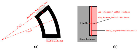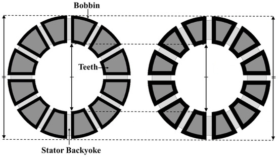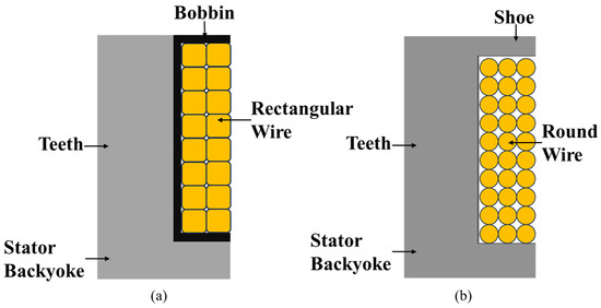 圖 2. 2.2. 繞線方法:直接繞線和卷繞式 上述導體可根據其在定子上的繞線方式采用兩種繞線方法。第一種方法是將導體直接繞入定子槽內,而第二種方法是將導體預先繞制在塑料線圈架上,然后將其插入槽內,最后完成連接。直接繞線法通常應用于帶底座的結構。雖然該方法可以通過調整槽口大小來保證電磁性能,但其缺點在于,由于AFPMSM定子齒內外兩側的厚度與RFPMSM不同,繞線機的運動必須相對復雜,因此難以進行機械繞線[ 2.3. 按結構劃分的繞線方法的應用和選擇標準 鑒于上述原因,設計人員必須全面考慮AFPMSM繞組形狀和方法的特性,并根據定子結構選擇最合適的組合。基于此,本文對帶底座的結構采用圓形導線直接繞制法,對不帶底座的結構采用矩形導線插入式繞制法。 圖 3顯示了兩種選定定子結構的橫截面積。這并非旨在直接比較兩種結構的性能,而是為了在相同的約束條件下,針對每種結構采用合適的繞組方法,探討是否可以有效地應用通用的設計流程。下一章將提出適用于這兩種結構的逐步設計流程,并解釋該流程中需要考慮的關鍵設計變量和計算公式。