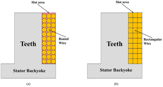 圖 1. 因此,在設計用于輪轂電機的AFPMSM時,必須同時考慮空間限制、高功率密度要求、繞組端部形狀限制以及制造挑戰等因素。這就需要一種能夠同時適應繞組結構和鐵芯幾何形狀的工藝。 因此,本文提出了一種適用于以疊片鋼板為鐵芯的鐵芯式AFPMSM的線圈繞制設計方法,該方法同時適用于卷筒式矩形線圈繞制和鞋式圓形線圈繞制。通過基于有限元法(FEM)的仿真,對每種繞制方法的結構和電磁特性進行了定量分析。盡管所提出的方法遵循標準的電磁設計原理,但由于AFPMSM的端繞線圈會延伸至內外徑,因此其幾何形狀受到一定的限制。為了克服這些限制,本文重新定義了設計變量,使得該方法能夠在固定的內外徑和軸向長度條件下進行。所提出的方法并非優化算法,而是一種在固定的內外徑、軸向長度和電流密度約束下進行的尺寸優化方法,旨在最大化這些約束條件下的輸出功率。在相同的外部約束條件下,對包括輸出功率、效率和轉矩脈動在內的關鍵性能指標進行了比較和評估。本文結構如下:第一節概述了AFPMSM及其作為輪轂電機的潛在應用。第二部分詳細介紹了兩種繞組方式的定子結構和繞組配置特性。第三部分提出了適用于兩種結構的逐步設計流程,并解釋了關鍵設計變量和計算公式。第四部分介紹了基于所提出的設計流程得到的模型的進一步設計,最后,第五部分總結了本研究的結論。 2. 定子結構和繞組方法的特點 AFPMSM的定子結構設計不僅對驅動系統的電磁和熱特性至關重要,而且對其制造可行性和可靠性也起著決定性作用。其中,鐵芯形狀和繞組配置是直接影響功率密度和設計靈活性的關鍵變量。這些設計變量在輪轂電機等應用中尤為重要,因為輪轂電機的驅動系統采用模塊化設計,需要在有限的空間內同時實現高功率密度和高效率。因此,為了設計出符合AFPMSM預期應用需求的定子結構,必須準確理解每種結構的特性、繞組方式之間的相互作用,并在設計初期就將由此產生的約束條件納入考量。 2.1 線材形狀:圓形線材和矩形線材 AFPMSM繞組中使用的導體大致可分為圓形導線和矩形導線。雖然這兩種導線具有相同的電氣特性,但它們不同的外部幾何形狀導致了不同的結構適用性和制造工藝特性。圓形導線是一種標準的圓形銅導體,與矩形導線相比具有更大的柔韌性[ 如圖2所示,矩形線圈在相同的槽面積內可以實現更高的填充率[