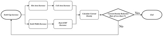 圖 12. 這降低了相同電壓下所需的電流密度,從而提高了電機的輸出極限。然而,由于卷帶式鐵芯結構的特性,齒寬尺寸存在物理限制。隨著齒橫截面積的減小,確保磁通路徑變得更加困難,這會降低磁通量,進而降低輸出功率。因此,找到增大槽面積帶來的電負載增加與減小齒橫截面積導致的磁通量降低之間的平衡點至關重要。針對每種齒寬情況,通過放置一匝與槽面積橫截面積相同的繞組進行空載有限元分析。然后基于反電動勢計算電流密度。隨著齒寬的減小,電流密度迅速下降,但超過一定限度后,下降速率減緩。設計齒寬選擇在電流密度下降速率低于1%的點。超過該點,增大槽面積帶來的好處將被磁通量降低所抵消。因此,所選齒寬代表了一種幾何形狀,該形狀既能最大限度地降低電流密度,又能滿足確保磁通路徑和可制造性的要求。圖 13顯示了齒寬確定的流程圖。